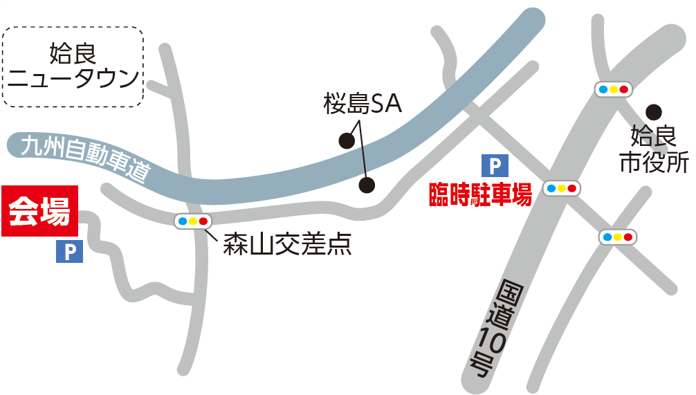 イベント当日は会場(ビーラインスポーツパーク姶良)の駐車場をご利用いただけますが、多数のご来場が予想されますため、臨時駐車場を開設致します。会場駐車場が満車の場合は臨時駐車場へご案内いたしますので、係員の指示に従って駐車いただきますようお願い申し上げます。