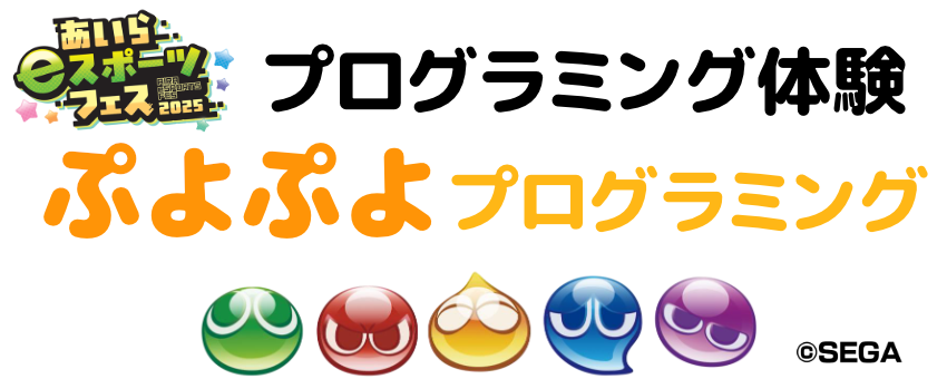 「あいらeスポーツフェス2025」の会場内でプログラミング体験『ぷよぷよプログラミング』を開催します。セガが展開するアクションパズルゲーム「ぷよぷよ」を題材にプログラミングを学習できる教材です。「ぷよぷよ」のプログラミングに挑戦しよう!